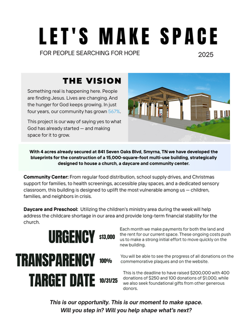 We have an exciting opportunity to establish a church and community center in Smyrna, where we can distribute food, clothing, diapers, school supplies, and other essential resources. This building will be the home of Mosaico Church, Bright Future Foundation (providing food, clothing, school supplies, and other urgent needs), and as well as new affordable daycare. Together we have pulled many families up from homelessness into thriving members of our community.